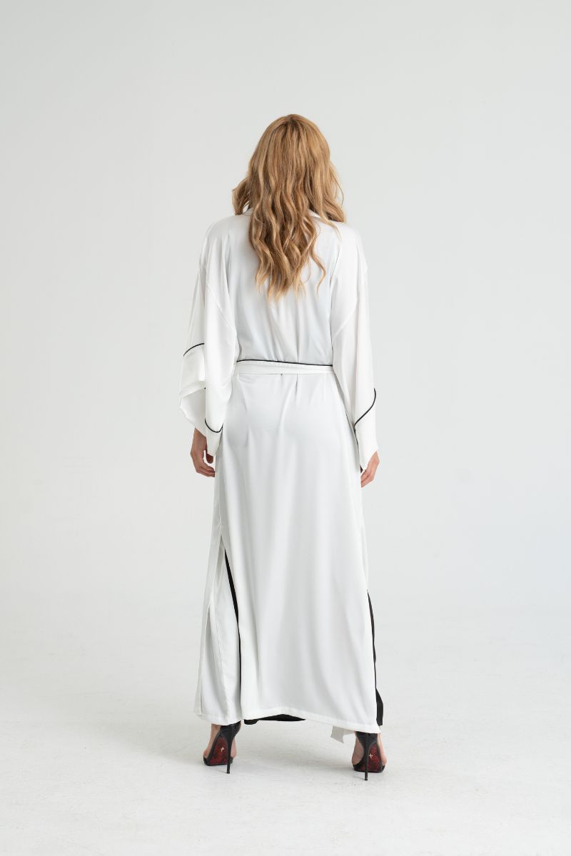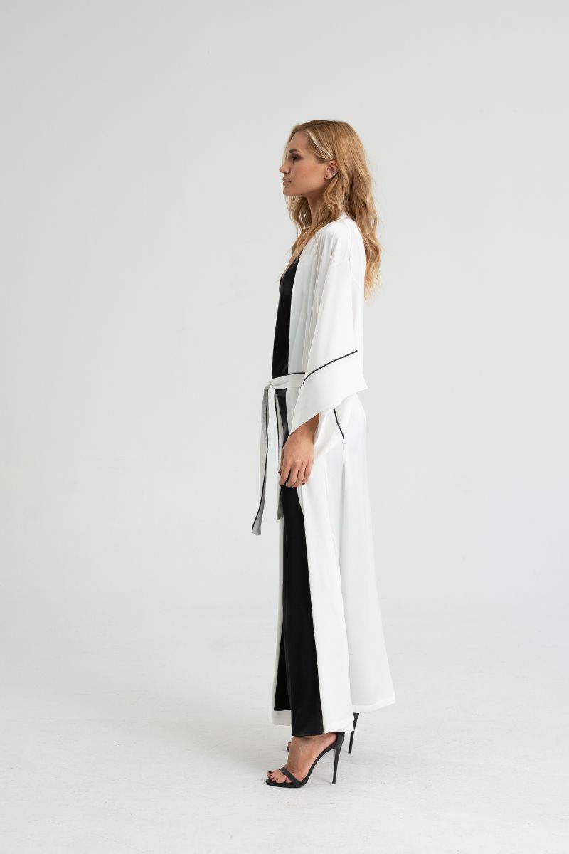 Kimono: A long kimono with ¾ sleeves creates a flattering silhouette, while delicate black satin, enriched with white details adds a touch of elegance.