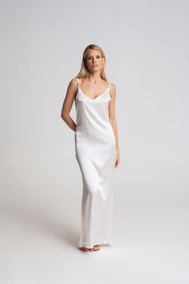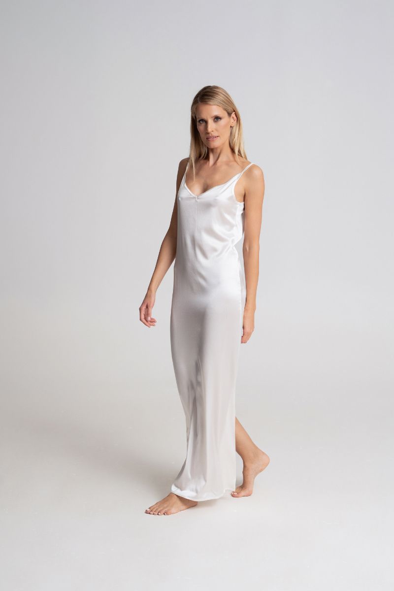 Skin long Nightgown: Experience elegance and comfort in our long satin nightgown. A low back cut and a cut that subtly follows your figure create a graceful silhouette. The slit adds a touch of appeal, ensuring you look and feel your best.