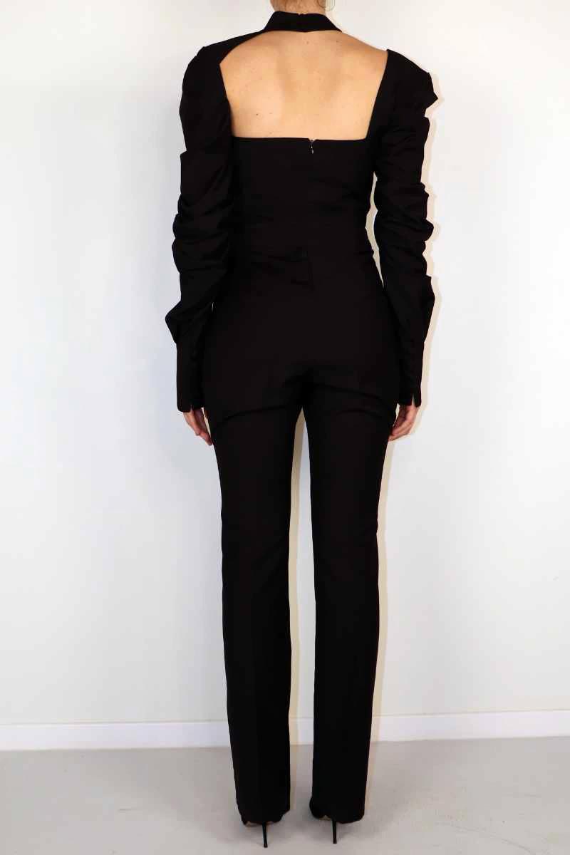 The IOE jumpsuit is a constructionally very demanding piece, and the inspiration was a very demanding lady. She wanted a jumpsuit that accentuated her good figure, that didn’t look like any other that can be found on sale, she had a dilemma whether to be one shoulder or still have both sleeves, she wanted a slit “somewhere” and some not so ordinary corset. We created a discreet slit above the belt in the front and a choker sleeve that is a separate piece so she could wear it on one shoulder or with both sleeves. Corset baskets are stable and reinforced with sponge, so the jumpsuit can be worn without a bra.
